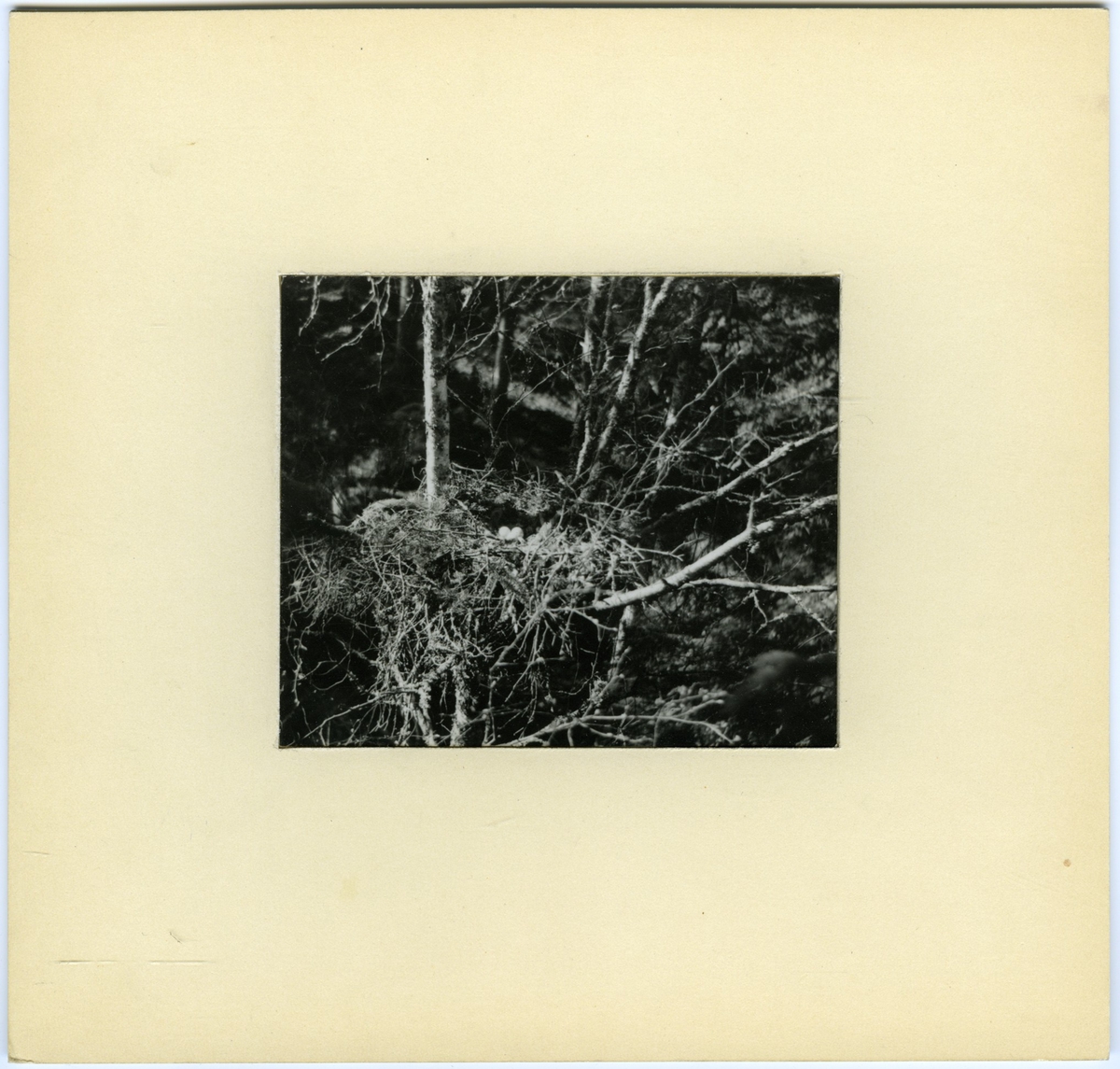 'Bildtext: ''Bo av ormvråk. Anmärkningsvärt är att äggen sakna bruna fläckar.'' :: Bo av ormvråk i träd, med ägg. :: :: Ingår i serie med fotonr. 7083:1-55.'