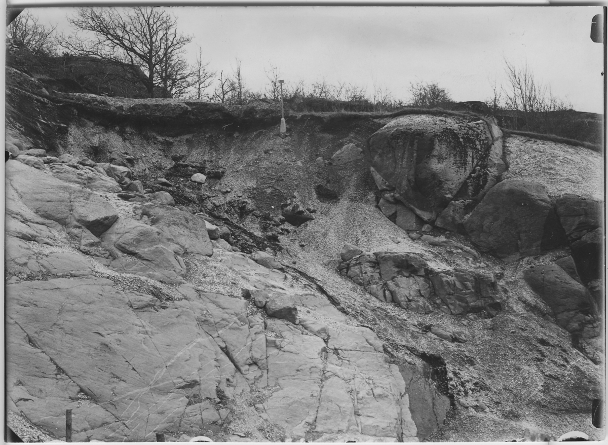 Snäckskalsbanken vid Bräcke, utanför Uddevalla. Vy med snäcksklalsbanken med berg och block i förgrunden. Buskar och träd i fonden.