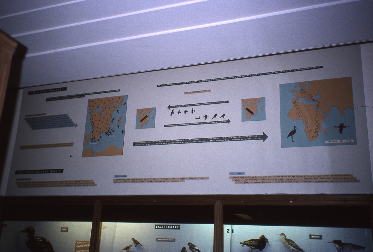 'Montrarna i fågelgången fotograferade före restaurering. :: Svenska fåglar. Flyttmönster. Flyttfåglar. Fjäderdräkt. :: :: Ingår i serie med fotonr. 6939:1-54.'