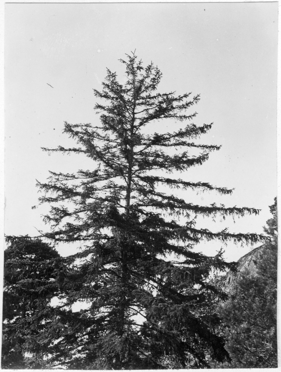 'Bildtext: ''Gran (form. Bandgran).'' Närbild på kronan hos en bandgran. :: :: Fotonr. 7046:119-185 indelade som ''Märkvärdiga träd i Göteborgs län och Bohus län''. Ingår i serie med fotonr. 7046:1-383, 7047:1-33 och 7048:1-67 med bilder från Länsjägmästare John Lindners bildarkiv.'