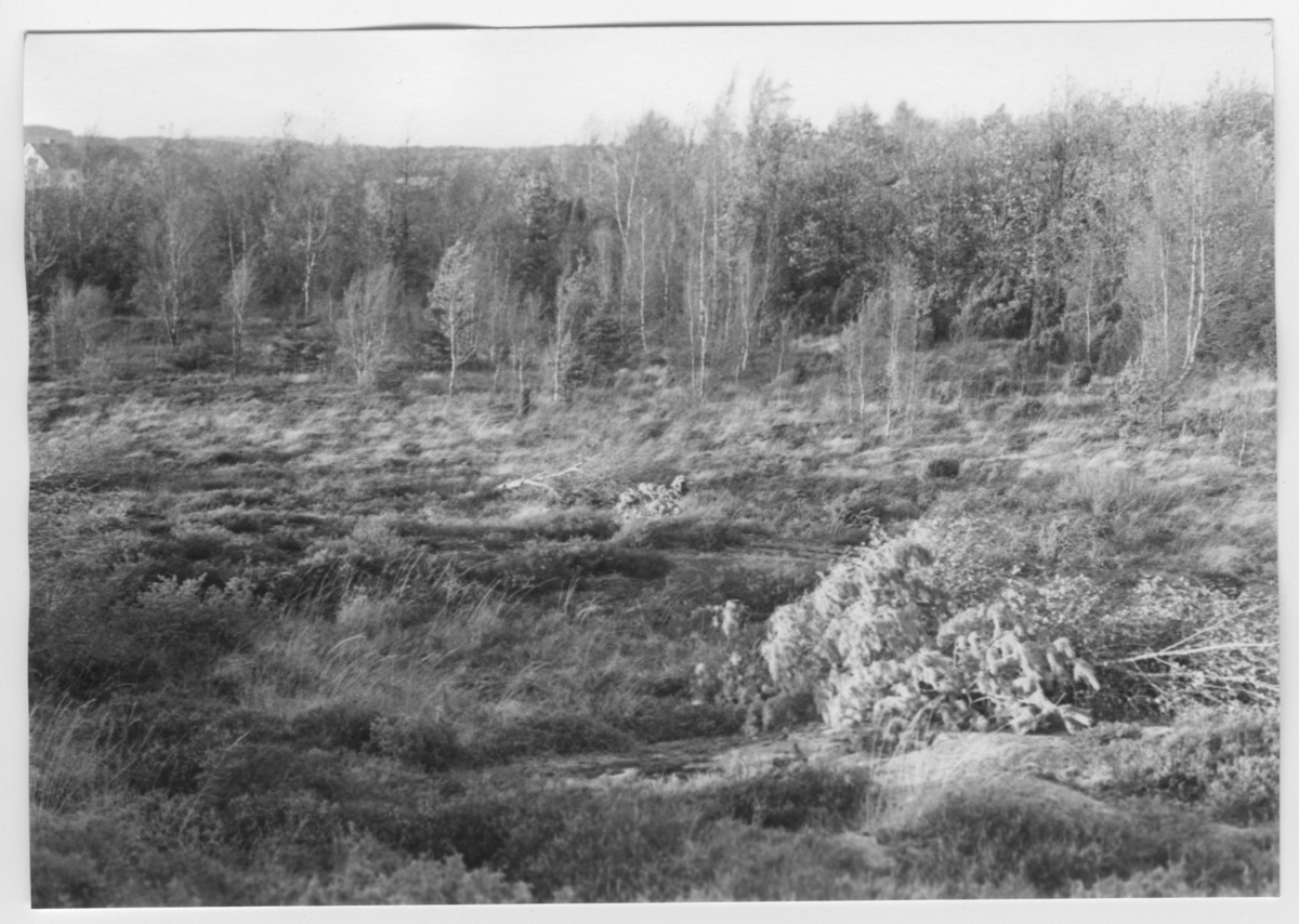 'Bildtext: ''Kärr. Riktning 334.'' :: I förgrunden kärret med lövträd och enbuskar i bakgrunden. Hus till vänster. :: :: Ingår i serie med fotonr. 6970:1-1125, dokumentation av Hisingens naturgeografi, visande landskapsformerna i stora drag och gjord inför exploateringen av området. Platserna för fotograferingen finns utsatta på karta i skala 1:4000 som finns på Göteborgs Naturhistoriska musem. Fotoriktningen mättes med kompass i gammalgrader.'