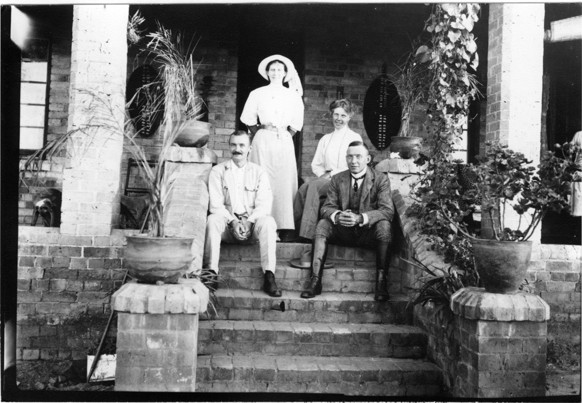 'Diverse fotografier från bl.a. dåvarande Nordrhodesia, nu Zambia, tagna av Konsul Magnus Leijer. :: :: 2 män sittande på trappan till en tegelbyggnad, ovan dem sitter och står 2 kvinnor på verandan till byggnaden.'