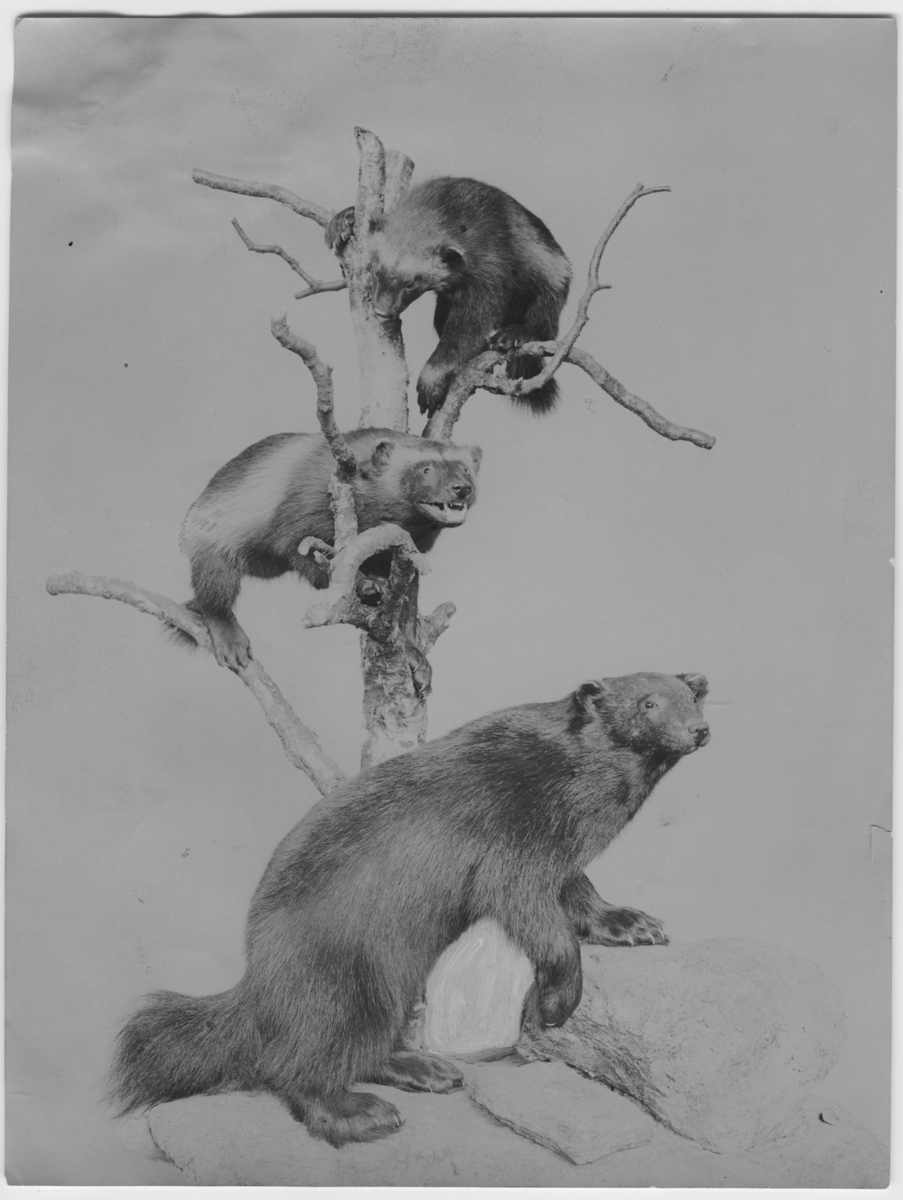 '3 järvar monterade i och vid träd. Hane och hona (ungar), monterade i trädet och gammal hane framför. :: :: Ma.su 354 hane nederst. Fyndplats: Luleå lappmark, Altasapakte . Fynddatum: 1910-07-23. Utställd i monterskåp nr. 64 i däggdjurssalen på Götyeborgs Naturhistoriska Museum. :: :: Ma.su 355 hona överst. Fyndplats: Luleå lappmark, Altasapakte . Fynddatum: 1910-07-23. Utställd i monterskåp nr. 64 i däggdjurssalen på Götyeborgs Naturhistoriska Museum. :: :: Järv, vuxen hane. Coll.an. 2972. Fynddatum: 1912-02-00. :: :: Bilden med i Göteborgs Naturhistoriska Museums Årstryck 1914 s. 30. :: :: Se även fotonr. 237 samt 238:1.'