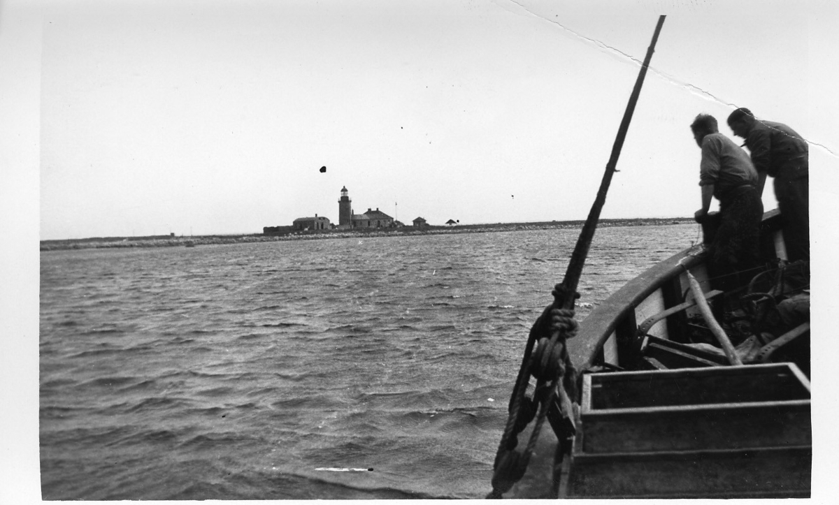 'Akka-expeditionen sommaren 1932: :: :: ''Skandia'' lodar in till Nordre Rönner, 2 st män på däck. Vy med fyren på Nordre Rönner. :: :: Ingår i serie med fotonr. 2400-2453.'