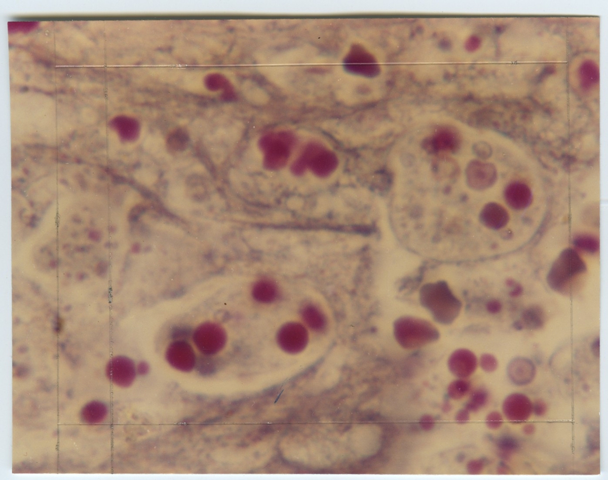 'Mikroskopbilder på amöba: :: Text på baksidan av fotot: ''Haematophagous Entamoeba histolytica in a section of intestinal mucous membrane showing red cells in various stages of digestion by the parasite x 2000. 85--1.65.'' :: :: Ingår i serie med fotonr. 5653:1-16.'