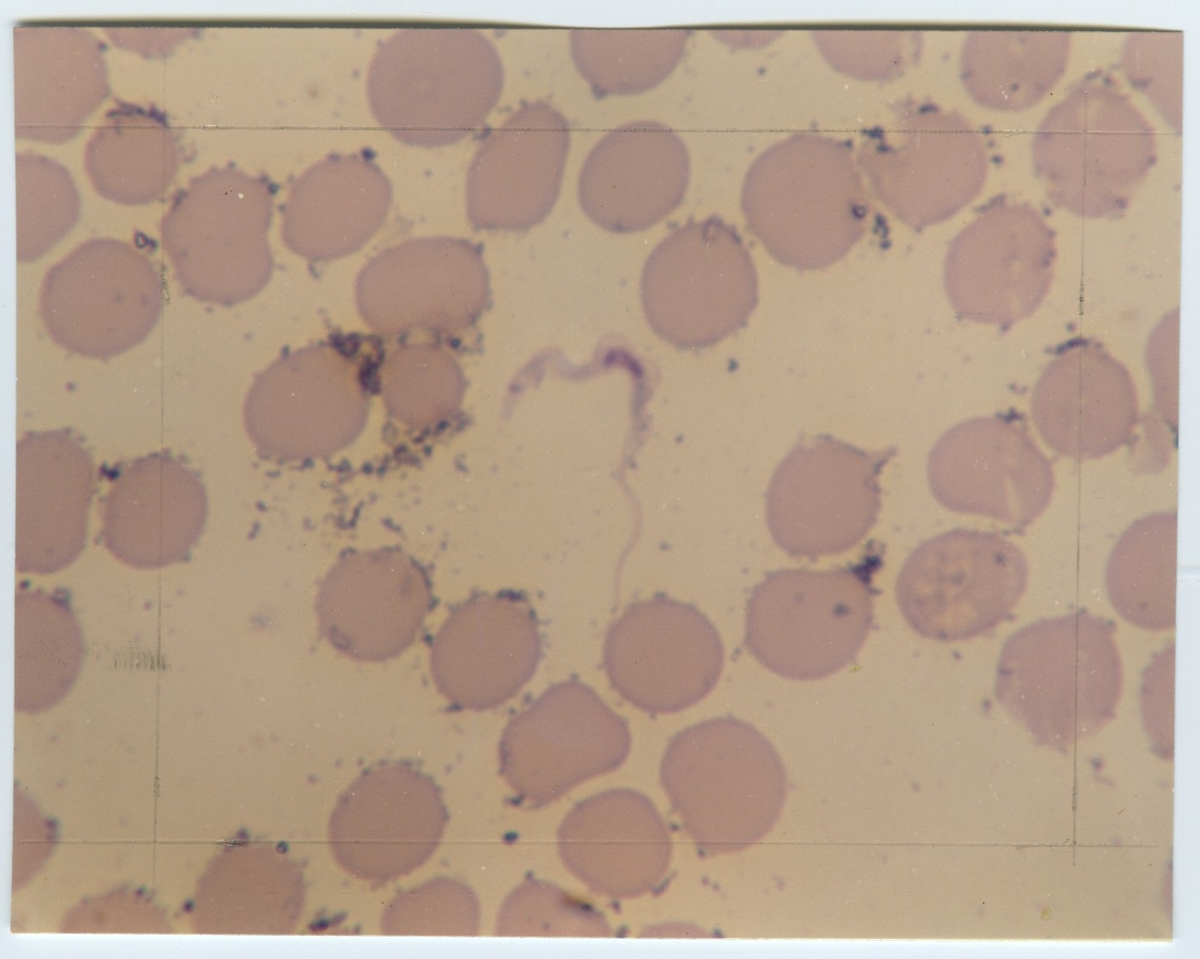 'Mikroskopbilder på amöba: :: Text på baksidan av fotot: ''The long form of T. rhodesiense in human blood (this is the poorest of the prints, but the illustration shows well the position of the nucleus and kinetoplast) x 2000. 75--1.45'' ''Trypanosoma'' :: :: Ingår i serie med fotonr. 5653:1-16.'