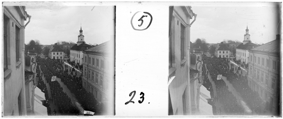 'Bildtext: ''Demonstrationståg 1 maj.'' :: Gatuvy med folkmassa, åskådare, längs gata med hus och ev. kyrka, torg. På gatan går demonstrationståg. :: :: Ingår i serie med fotonr. 5259:1-16. Se även hela serien med fotonr. 5237-5267.'