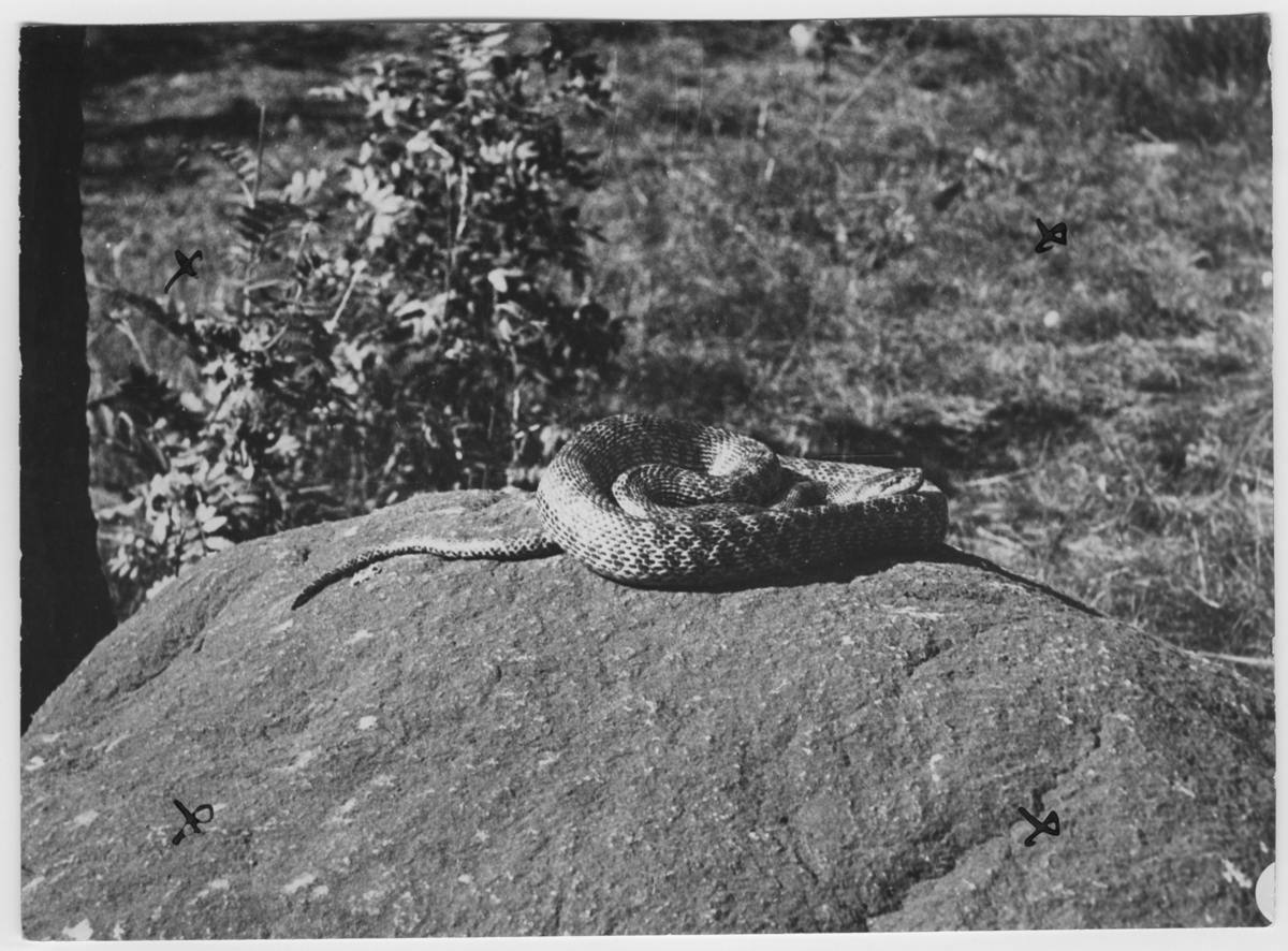'1 strimmig snok ligger ihopringlad på ett stenblock. (Sid. 83.) :: :: Ingår i serie med fotonr. 4501:1-60 ur ingenjör Otto Cyréns ''Ormar i fantasi och verklighet''. Bilden med på s. 157 i verket.'