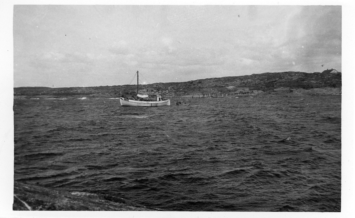 'Kattegattexpeditionen 1933: :: :: Del av Hesselö sett från annan ö. Del av klippa i förgrunden, stor båt med mast, samt mindre båt, synlig mellan öarna. Hus och brygga. :: :: Ingår i serie med fotonr. 2804-2826.'