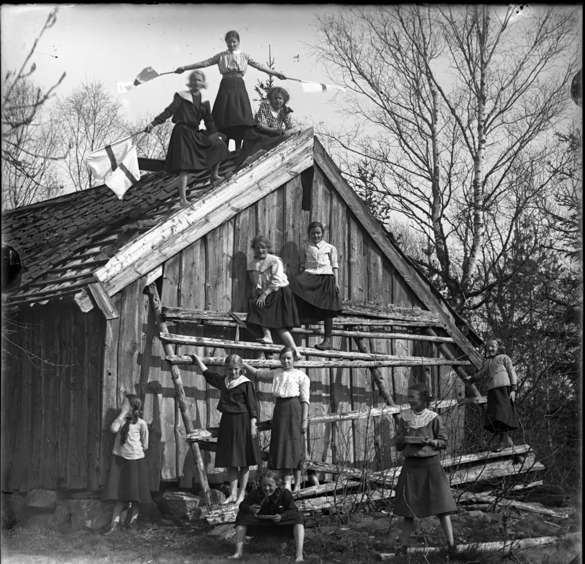 'Gruppbild, 11 kjolklädda flickor på taket samt framför en husgavel till trähus med tegelklätt tak, en del fattas. Flickor uppklättrade på träställning stående invid gaveln. Viftande med slags flaggor. 2 flickor med tallrikar i händerna. :: :: Ingår i serie med fotonr. 5415:1-10.'