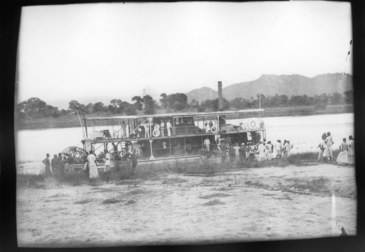 'Diverse fotografier från bl.a. dåvarande Nordrhodesia, nu Zambia, tagna av Konsul Magnus Leijer. :: :: Ett hjulfartyg liggande vid en strand, på stranden står ett flertal människor, likså på fartyget.'
