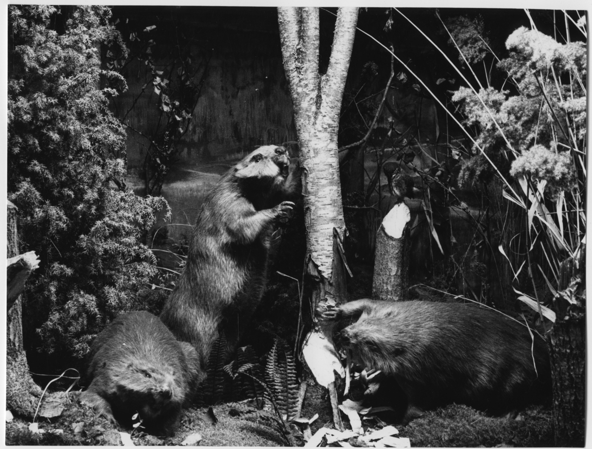 'Bilder från Göteborgs Naturhistoriska museum tagna som övningsuppgift av fotografer på Göteborgs Stads yrkesskolor: :: :: 3 st bävrar i utställningsmonter, bäverfamilj. Ma. su. nr 1161, 1162 och 1163. :: :: Ingår i serie med fotonr. 6953:1-53.'