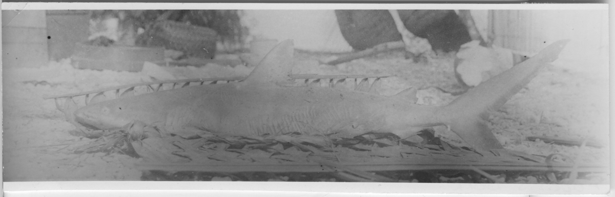 'Förstoring av hajen på fotonr 4352:6. Haj liggandes på matta av flätade palmblad. :: :: Ingår i serie med fotonr. 4352:1-7. Se även fotonr. fotonr. 4349-4351.'