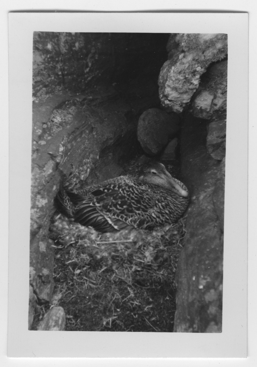 '1 ejderhona liggande i bergsskreva. :: :: Text på baksidan av fotot: ''1 ejderhona vilar tryggt djupt inne i en bergsskreva på reden på Äggholmen. En berghäll låg över honan, som synes av bilden. Fotografiet är taget på 1 meters avstånd. Man ser det rikliga dunet från henne framför reden.'' :: :: Ingår i serie med fotonr. 4544:1-35.'