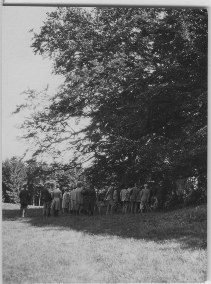 'Biologiska förenings utfärd till Fjärås-Onsala-Nidingen-Malön-Kalvön: :: :: Ljusa lyckan på Fjärås. Jätteboken. Grupp, ca 20 st män samlade invid eken. :: :: Se fotonr. 2489-2500 och 2501-2515 från samma utfärd.'