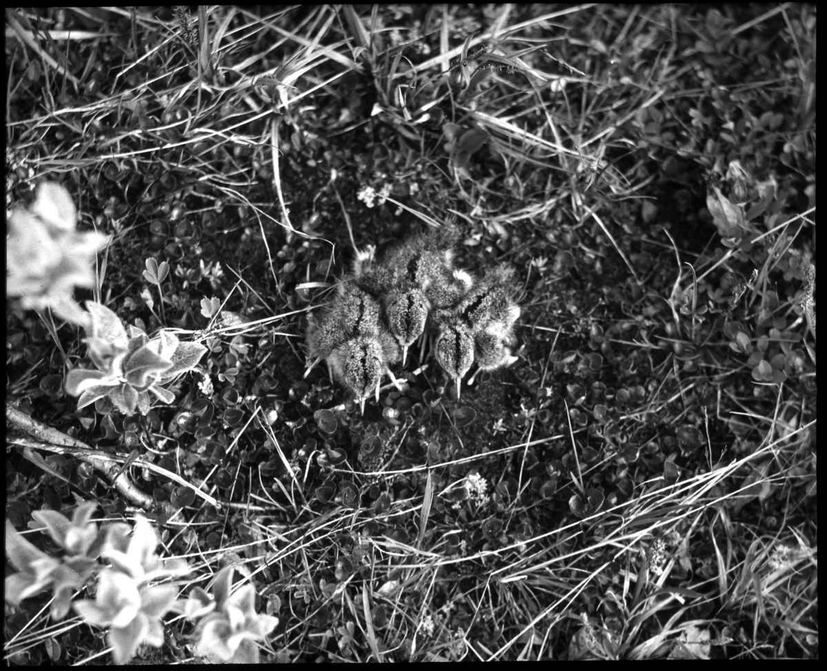 'Bildtext: ''Ungar av drillsnäppa.'' Bo med 5 ungar. I örtvegetation. :: :: Ingår i serie med fotonr. 5157:1-9 numrerade med bildnr 120-128. Se även hela serien med fotonr. 5155-5174.'