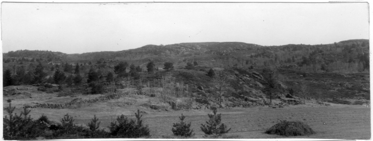 'Bildtext: ''Bångefjället från väster.'' Vy med stenmurar och ev. åkermark i förgrunden. :: :: Fotonr. 7046:1-84 indelade som ''Landskapsbilder från Göteborgs- och Bohus län.'' Ingår i serie med fotonr. 7046:1-383, 7047:1-33 och 7048:1-67 med bilder från Länsjägmästare John Lindners bildarkiv.'