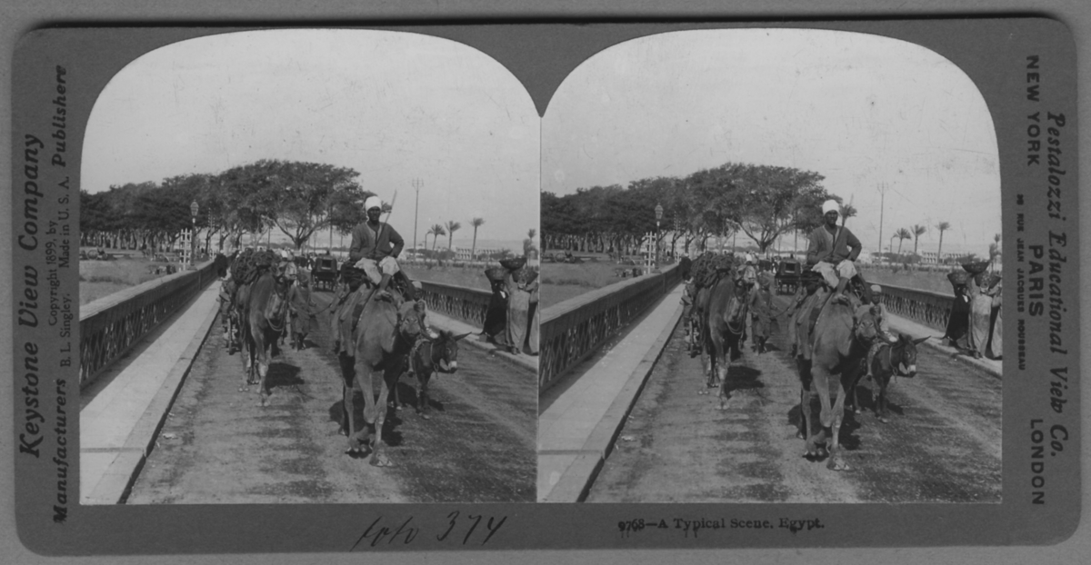 'Man rider på kamel, lastad kamel i rep bakom. :: :: ''9768 - A typical scene, Egypt''. :: :: Ingår i serie med fotonr. 315-422.'