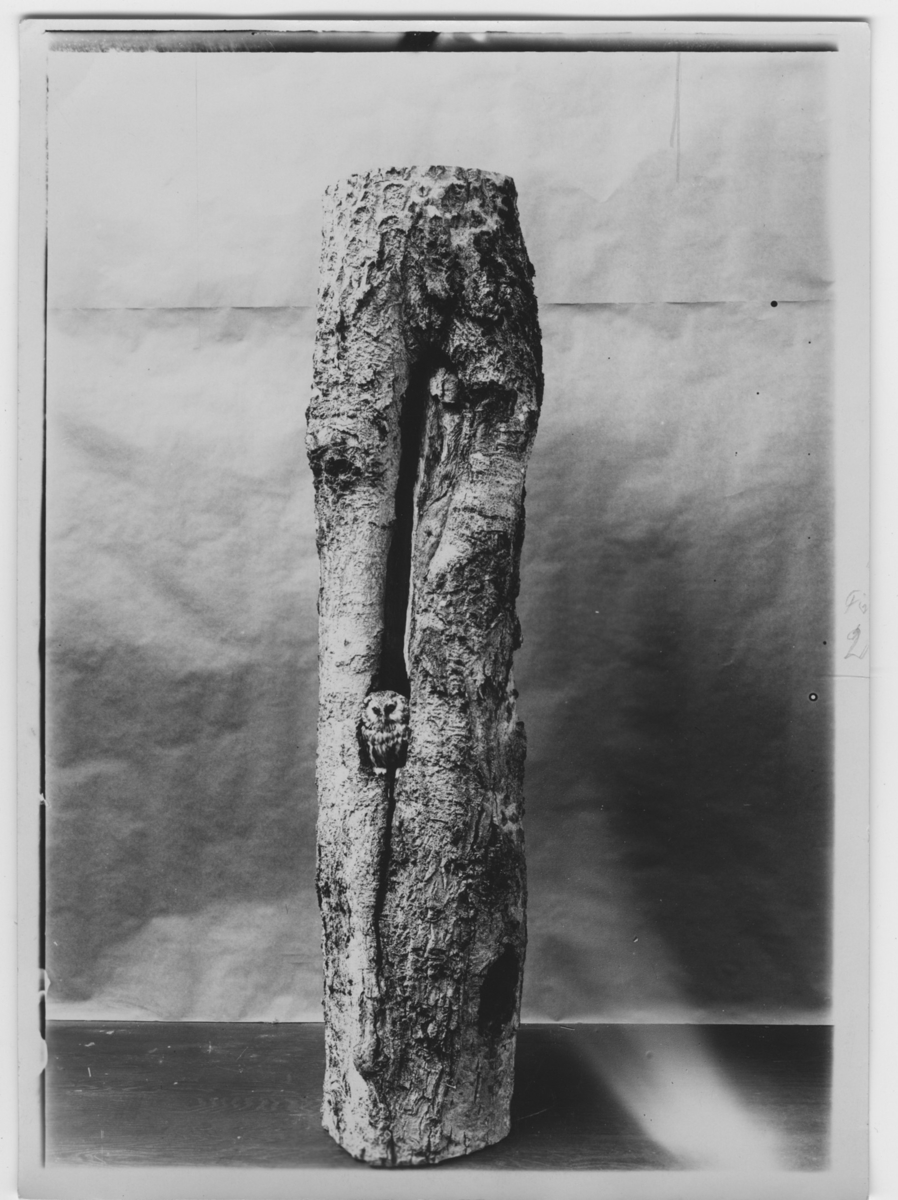'Pärluggla, hona i boet. Monterad i trädstam. Montering gjord av David Sjölander. Fynddatum: 1929-05-00. :: :: Finns i monter nr. 170 i fågelgången (2007-05-25) på Göteborgs Naturhistoriska museum. :: :: Bilden finns med i Göteborgs Naturhistoriska Museums Årstryck 1930 s. 24.'