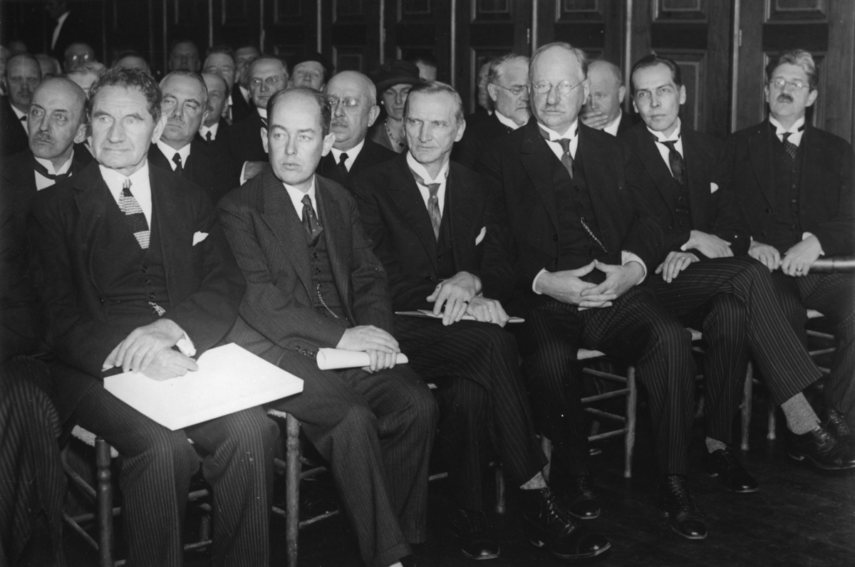 'Naturhistoriska museets 100 årsjubleum: :: :: Drygt 20 män och några kvinnor sittande på stolar. :: Från vänster till höger: dr T.H. Mortensen, Köpenhamns universitets zoologiska museum, Professor T. Gislén, Lundgren, Stockholm, intendent H. Bergman, Malmö och professor Carl Skottsberg, Göteborgs botaniska trädgård, längst till höger. :: :: Bland inbjudna var också, Alf Wollenbaek, Oslo universitets zoologiska museum och professor August Brinkman, Bergens museum och professor Sixten Bock, Riksmuseet i Stockholm och professor Albert Tullgren, Statens Växtskyddsanstalt och dr Gunnar Gustafsson, Kristinebergs zoologiska station. Bernhard Karlgren från Vetenskaps- och vitterhetssamhället och :: :: Ingår i serie med fotonr. 3029-3034.'