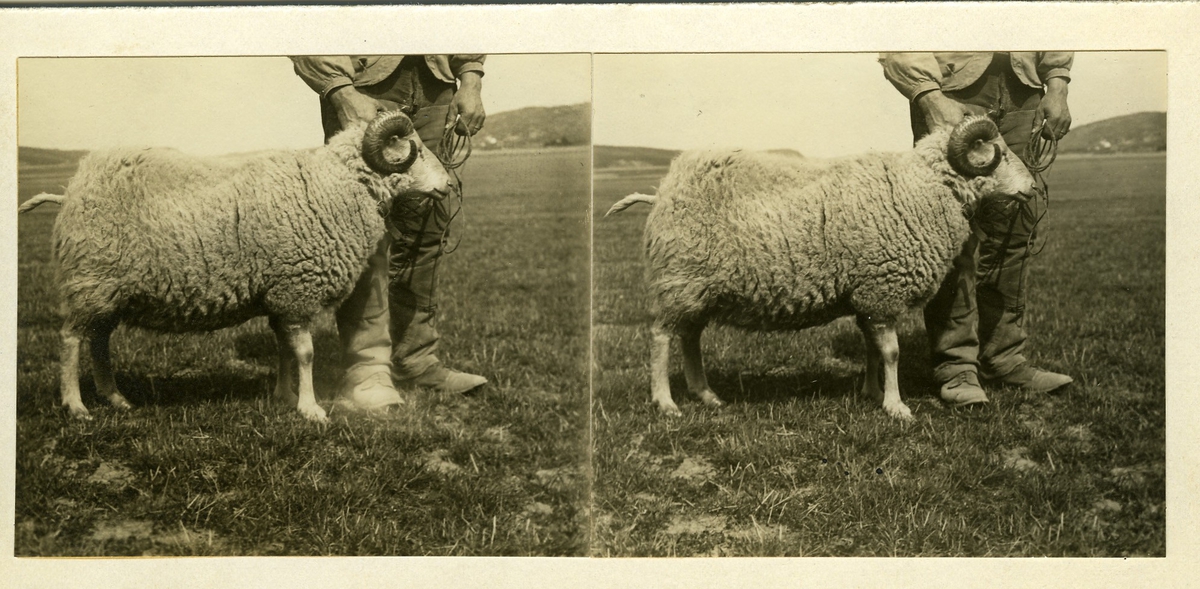 'Får på äng. Hane, fåren är av s.k. öronlös ras :: :: Ingår i serie med fotonr. 529-531.'