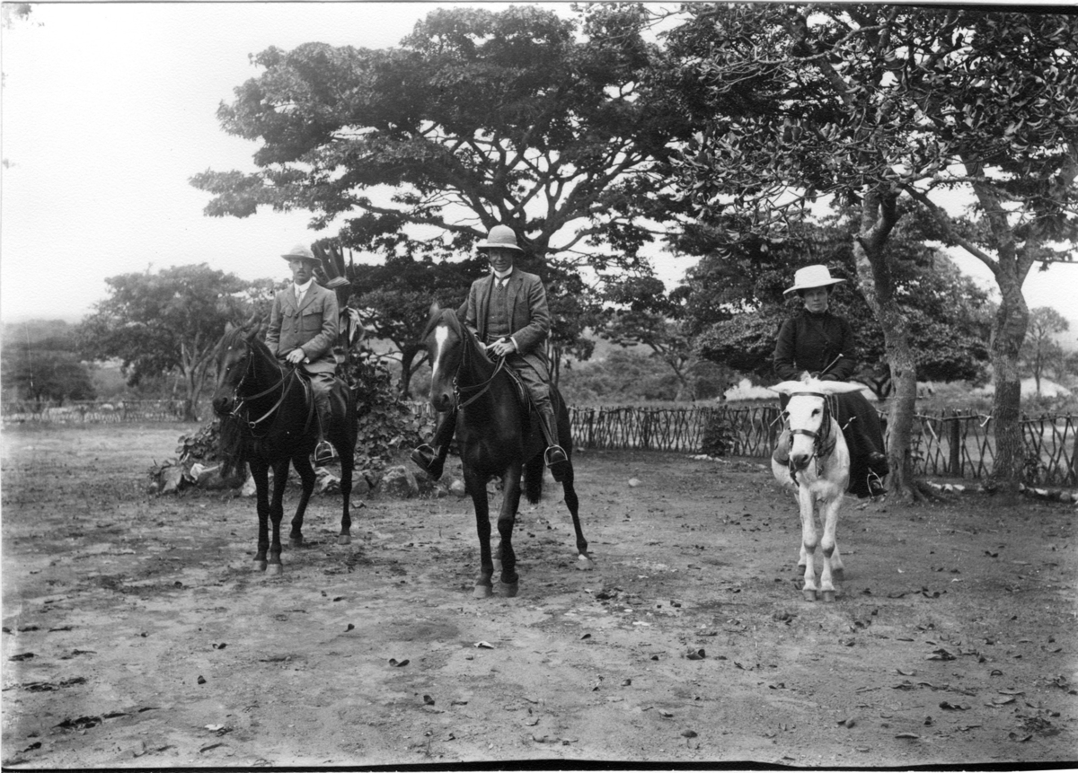 'Diverse fotografier från bl.a. dåvarande Nordrhodesia, nu Zambia, tagna av Konsul Magnus Leijer. :: :: 2 män sittandes på varsin häst, kvinna sittandes på mindre häst (åsna?). Framför staket och träd.'