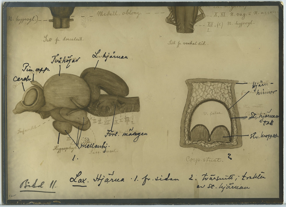 'Teckning av hjärna hos lax, illustrerat från sidan och som tvärsnitt i trakten av stora hjärnan. Latinska namnen på organens delar är utsatta. :: Anteckningar i bläck på ett exemplar. :: :: ''Fotografier använda vid dissektionskursen våren 1928'' . :: Avfotograferade teckningar på skelett och organ. :: På baksidan av vissa står det Kerstin Nyblén :: V.T.-18 :: ur bok'