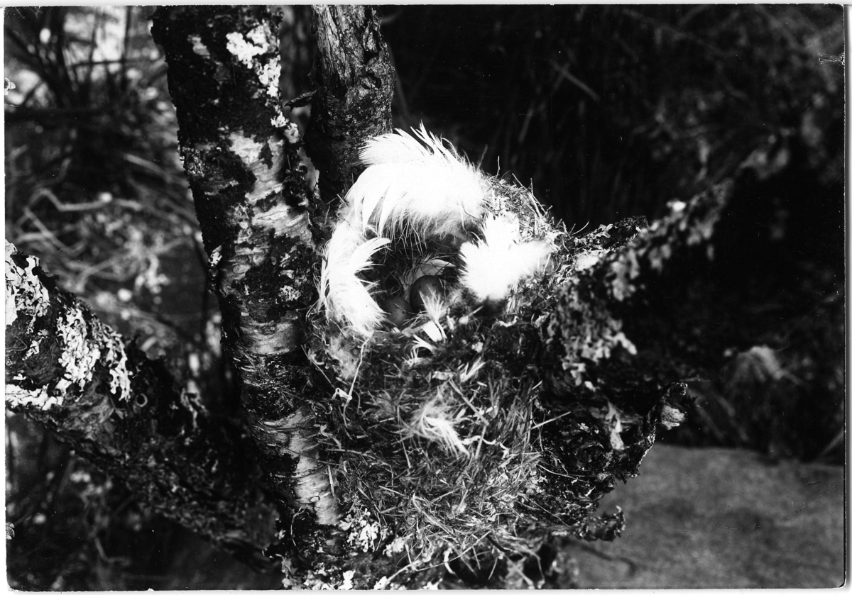 'Bergfink, bo i trädklyka sett ovanifrån, 2 ägg synliga. :: :: Se även fotonr. 22.'