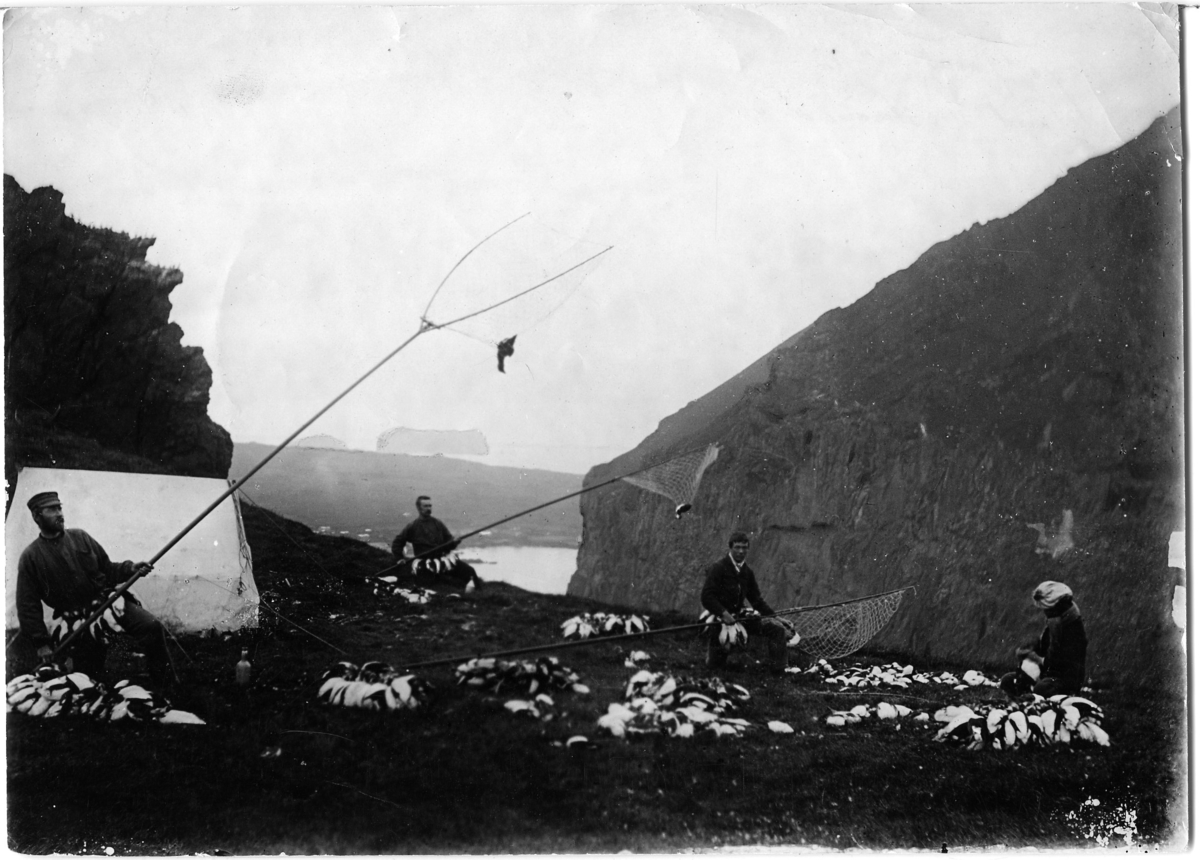 Fågelfångst, 4 män varav 3 med håvar vid ett tält. Högar med fångade fåglar på marken. Berg intill och vatten i bakgrunden.