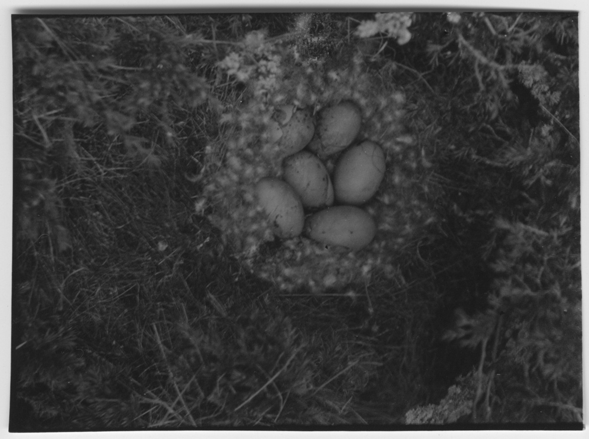 'Ejder, bo med 6 ägg. Dunkrans i boet. Ev. intill enbuske. :: :: Ingår i serie med fotonr. 817-841.'