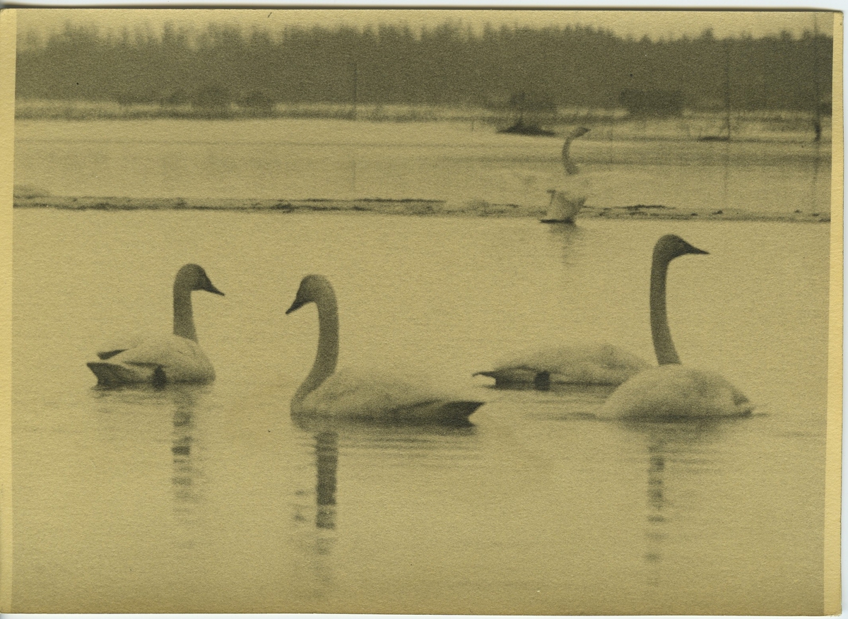 '5 sångsvanar, i vatten. Ridå av skog i bakgrunden. :: :: Ingår i serie med fotonr. 998-1001.'