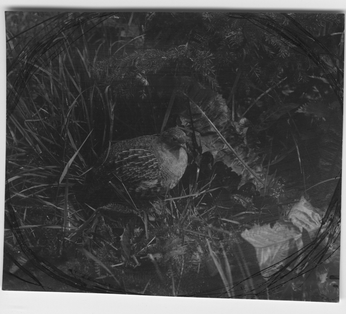 'Rapphöna, vid boet, på kyrkogården. Intill gran. En inringning med bläck är gjord på fotot, bilden ser ut att vara beskuren. :: :: Ingår i serie med fotonr. 817-841.'
