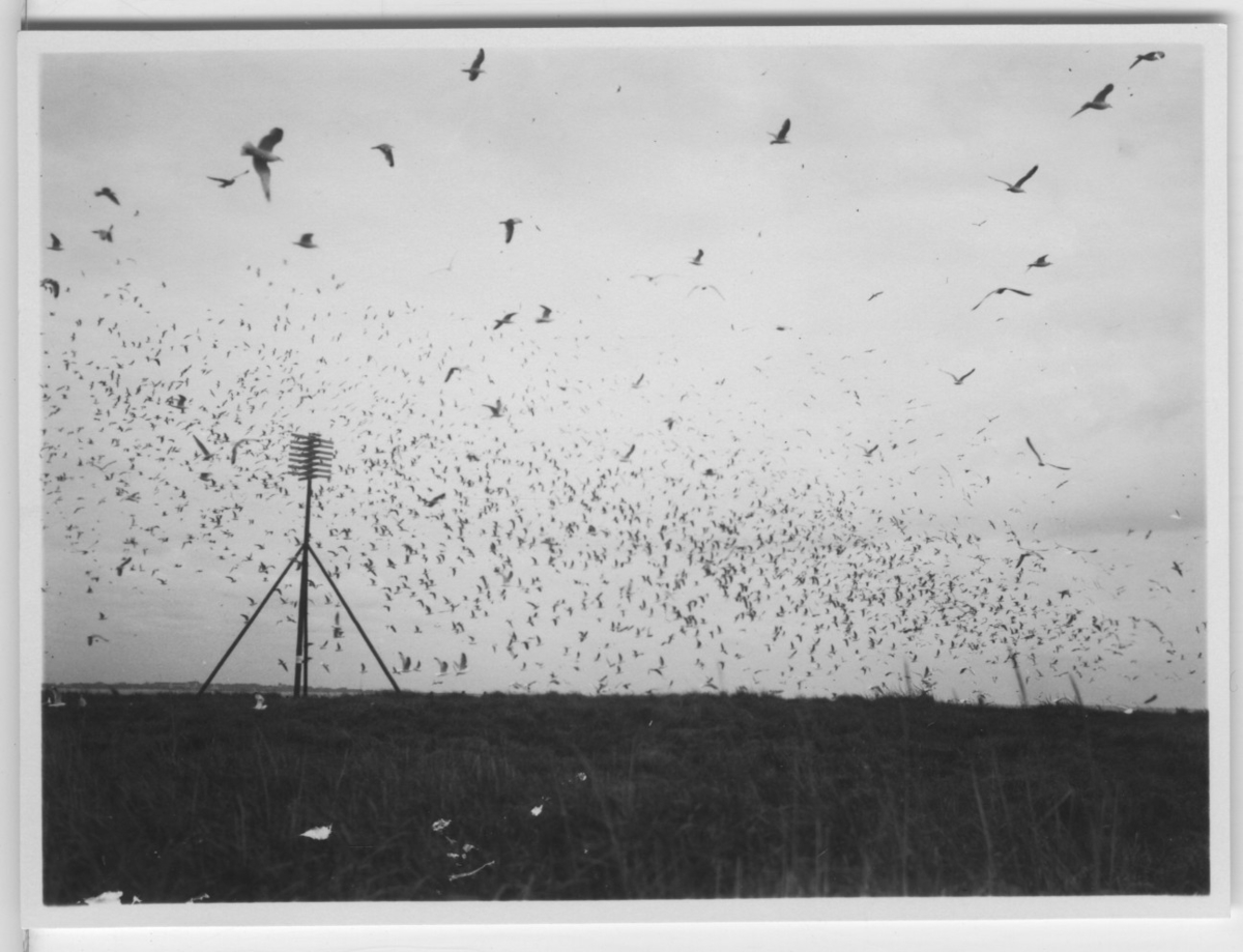 'Göteborgs Biologiska förenings utfärd till Måkläppen och Falsterborev: :: :: ''Fåglar över Måkläppen''. Vy med fågelmoln. :: :: Se fotonr. 1384-1395, 1618-1639, 1640-1648 samt 3229 från samma utfärd.'