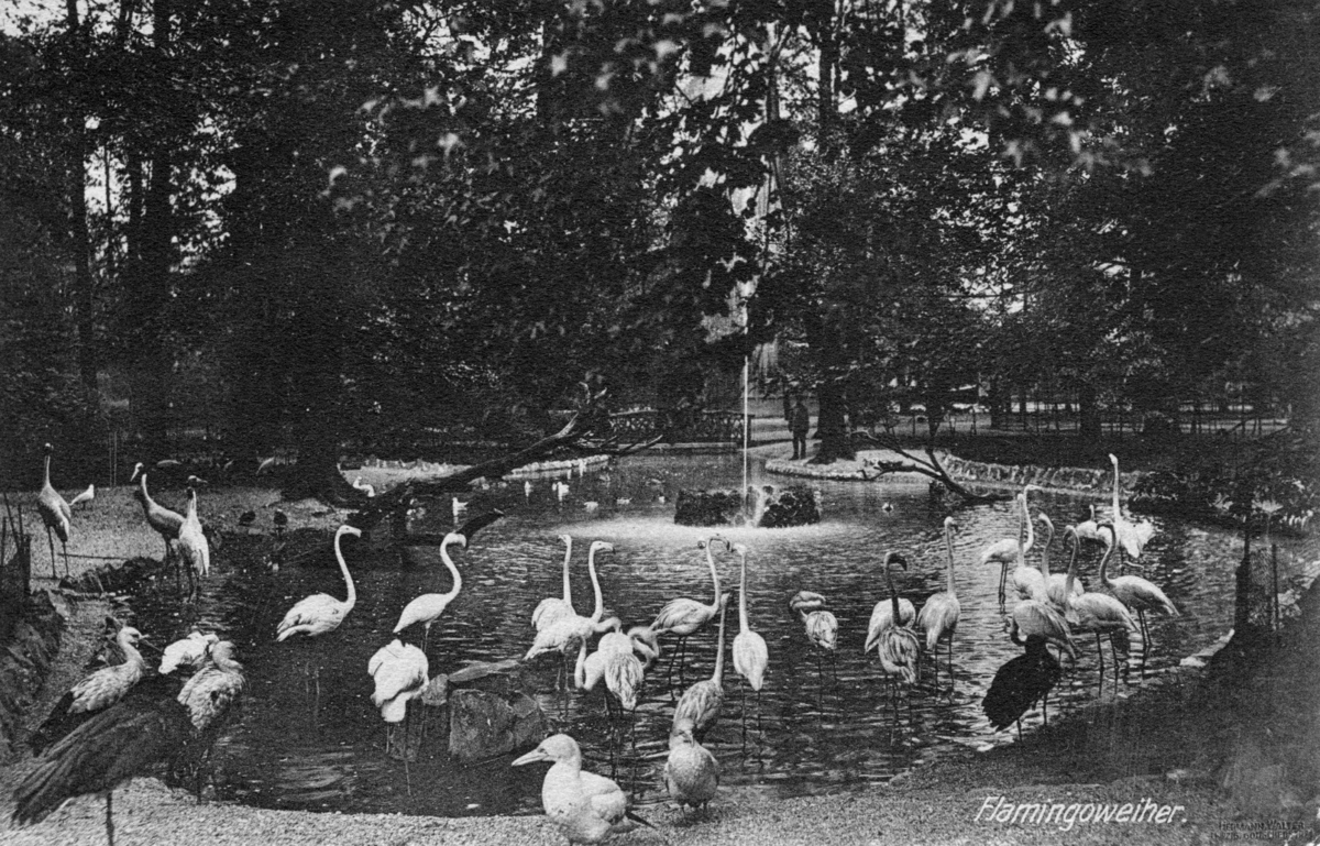 'Flamingo samlade vi en damm. Text på vykortet: ''Flamingoweiher.'''