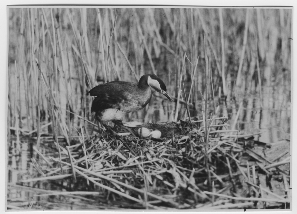 'Gråhakedopping, vid boet bland vass med 2 st ägg, sedd snett framifrån. Närbild. :: :: Ingår i serie med fotonr. 2272-2304.'