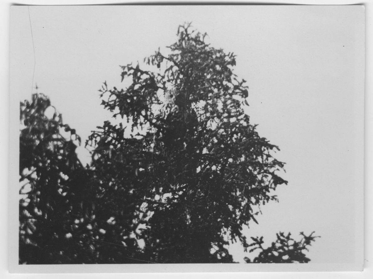 'Berguv, i gran. Sittande nästan i längst upp i toppen. :: :: Ingår i serie med fotonr. 1771-1837. Se även fotonr. 3151-3200.'