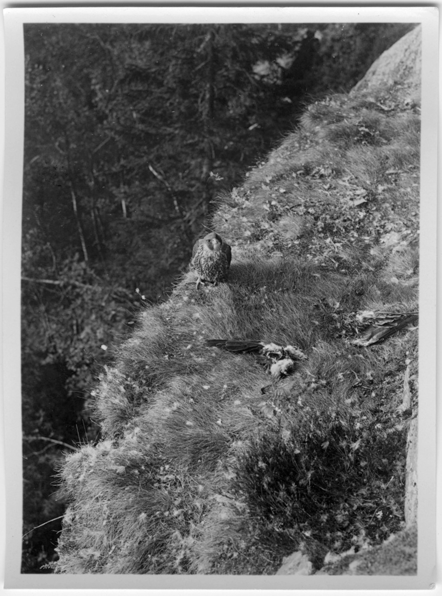 'Pilgrimsfalk, sittande på avsats intill bergvägg. Framför ligger en kråkas vingar, resterna av ett byte. :: :: Ingår i serie med fotonr. 1771-1837. Se även fotonr. 3151-3200.'