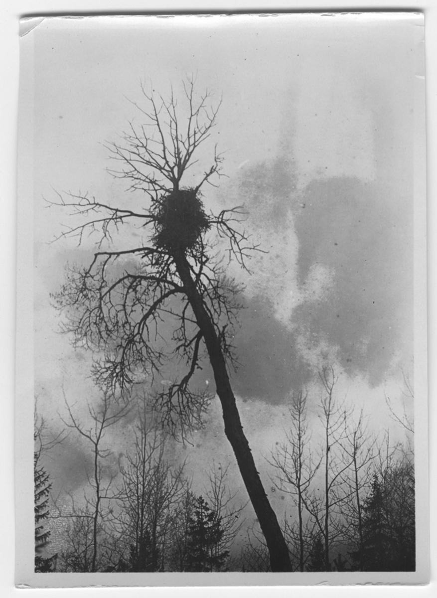 'Havsörnbo i en jättestor, lutande, nästan torr asp. Omgivning med träd. :: :: Ingår i serie med fotonr. 1771-1837. Se även fotonr. 3151-3200.'