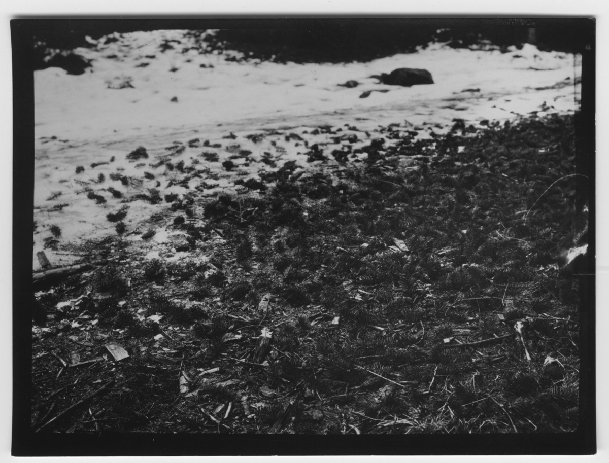 'Snöklädda marken täckt av granskott. Text på baksidan: ''Av ekorre avbitna granskott.'' :: :: Ingår i serie med fotonr. 2347-2399.'