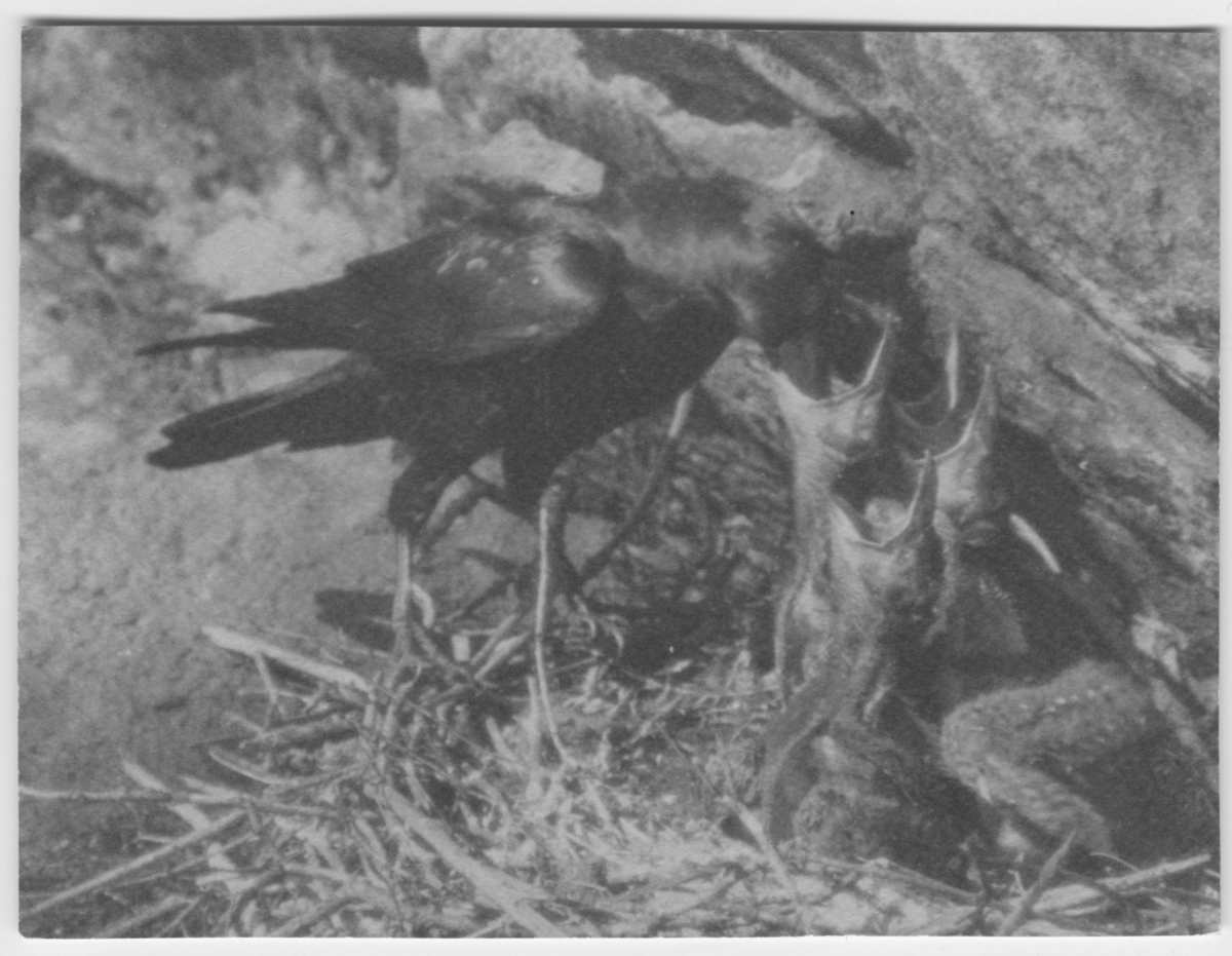 'Korpen matar sina 3 st ungar i boet. Närbild. Delförstoring av fotonr. 2538. :: :: Ingår i serie med fotonr. 2524-2557.'