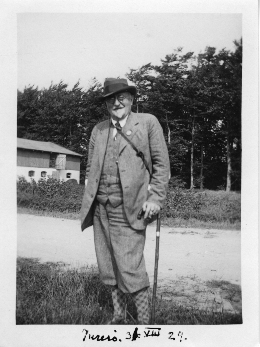 Leonard Axel Jägerskiöld stående vid grusväg, i förgrunden. Iklädd hatt, käpp och glasögon. I bakgrunden syns ekonomibyggnad, lada och lövträdsvegetation.