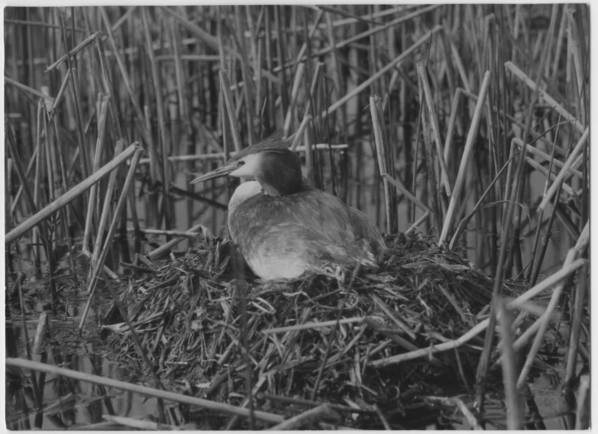 'Skäggdopping på boet. Sedd snett bakifrån, närbild. :: :: Ingår i serie med fotonr. 2272-2304.'