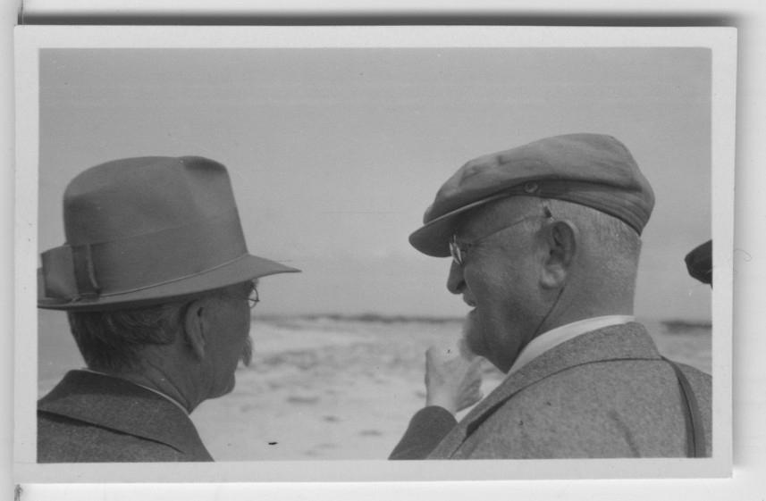 'Göteborgs Biologiska förenings utfärd till Måkläppen och Falsterborev: :: :: Dr Paul Rosenius och Leonard Axel Jägerskiöld, till höger. Närbild bakifrån. Samma motiv som fotonr. 1395. :: :: Se fotonr. 1384-1395, 1618-1639, 1640-1648 samt 3229 från samma utfärd.'