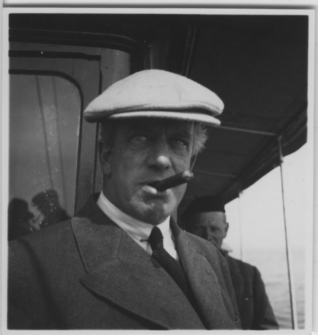 'Biologiska föreningens utfärd till Läsö och Nordre Rönner: :: :: Ingenjör Arvid Lignell på båten ''BRIS''. Närbild , cigarr i munnen. Iklädd mössa. :: :: Se fotonr. 2674-2734, 2687-2691, 2692-2711, 2714-2734, 2843-2863 och 2975 från samma utfärd.'