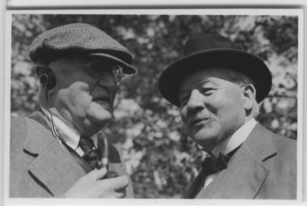 'Biologiska föreningens utfärd till Läckö och Ekens skärgård: :: :: Profofessor Leonard Axel Jägerskiöld med pipa och hörapparat till vänster och dr W. Lundgren, i närbild. :: :: Se fotonr. 3242-3254, 3255, 3256-3259, 3260-3285 samt 3889-3894.'