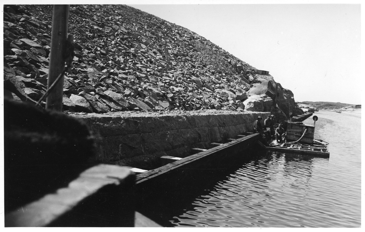 'Kabelläggningspråm i Sotenkanalen. 4 st personer sitter vid pråmen, nedanför sprängt? berg. :: :: Ingår i serie med fotonr. 3441-3452.'
