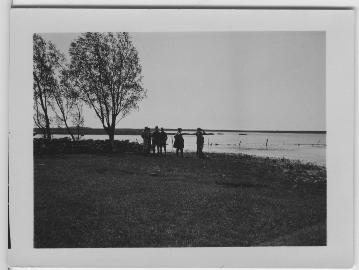 'Biologiska föreningens utfärd till Öland: :: :: 7 män intill våtmark, stenmur går ner till vattenkanten och fortsätter som staket ut i vattnet. Samma vy som fotonr. 2587. Stengärdesgård. :: :: Se även fotonr. 2607-2625, 2583-2606 samt 2883-2911 från samma utfärd.'
