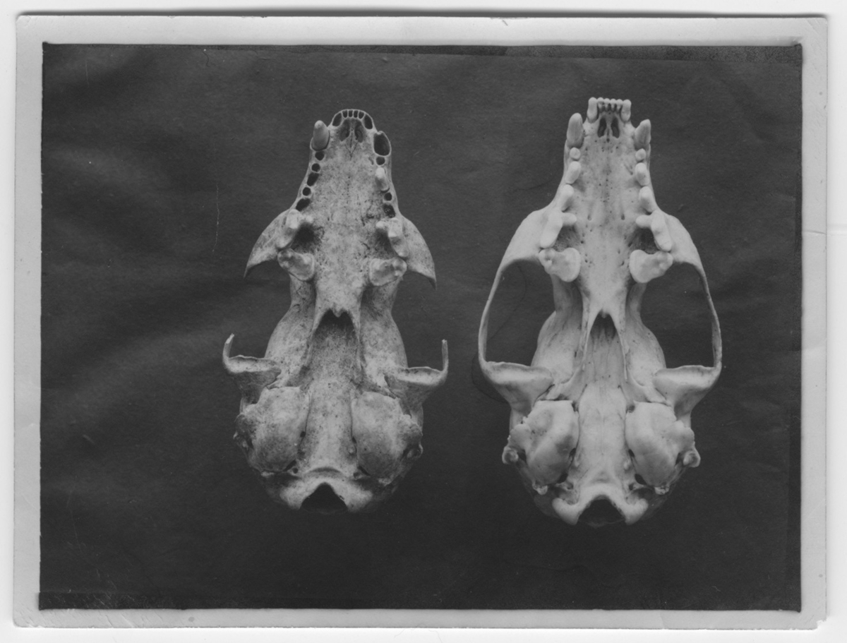 '2 st skallar av skogsmård sedda från undersidan. Subfossil Coll.an 5701. :: Coll.an. 205, på samma bild. Samma foto som fotonr. 2957:1. Fynddatum: 1930-00-00, sommaren.'