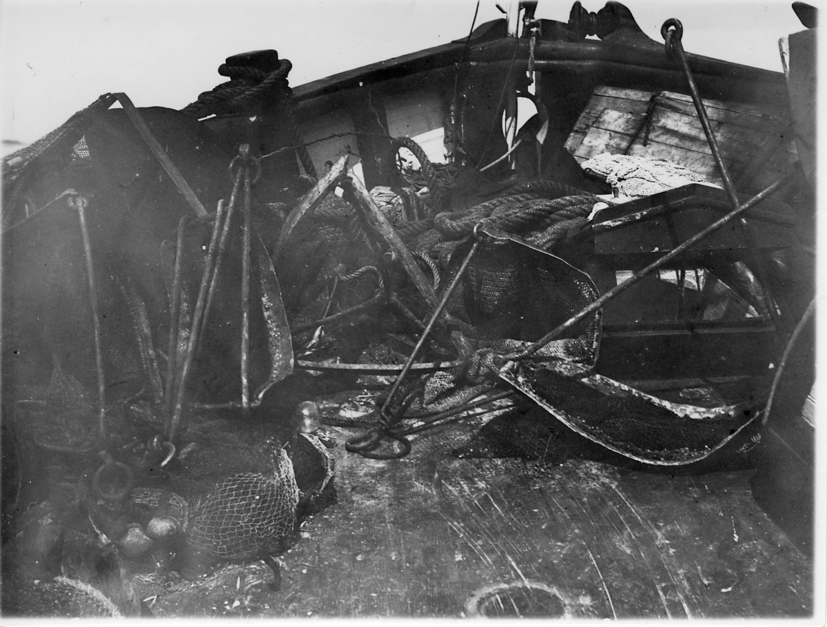 'Naturhistoriska muséets Skagerackexpedition med båten Skandia sommaren 1934: :: :: Utrustning för undersökning av havsfaunan liggande på fördäcket på båten ''Skandia''. :: :: Ingår i serie med fotonr. 3309-3317.'