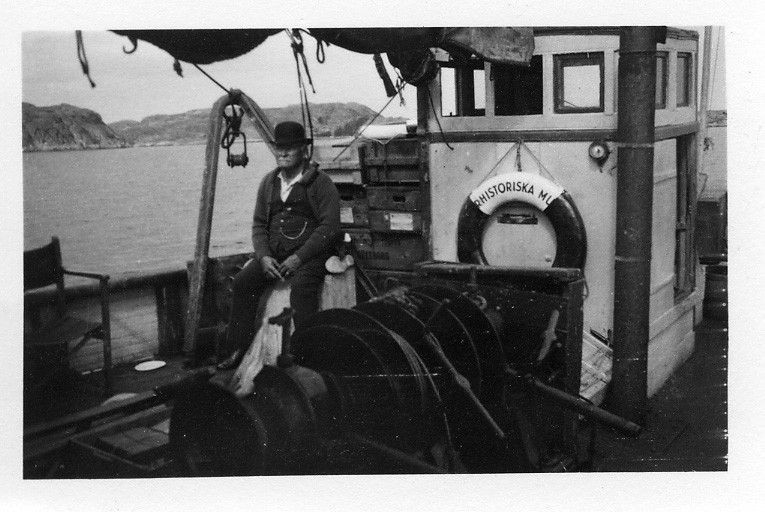 'Naturhistoriska muséets Skagerackexpedition med båten Skandia sommaren 1934: :: :: 1 man sittande på däck på en båt, bredvid honom en livboj med texten ''naturhistoriska museet''. :: :: Ingår i serie med fotonr. 3309-3317.'